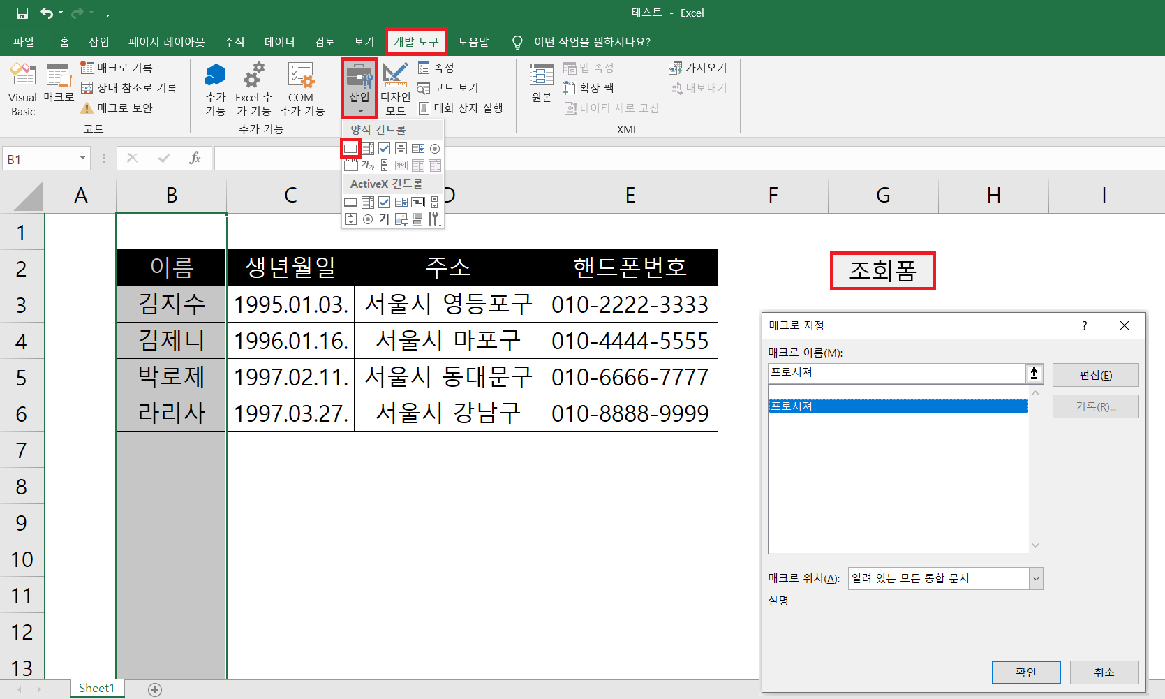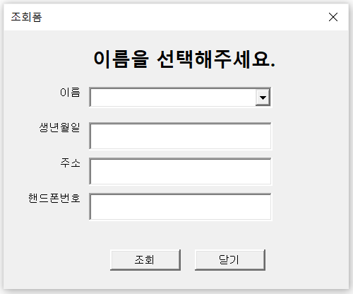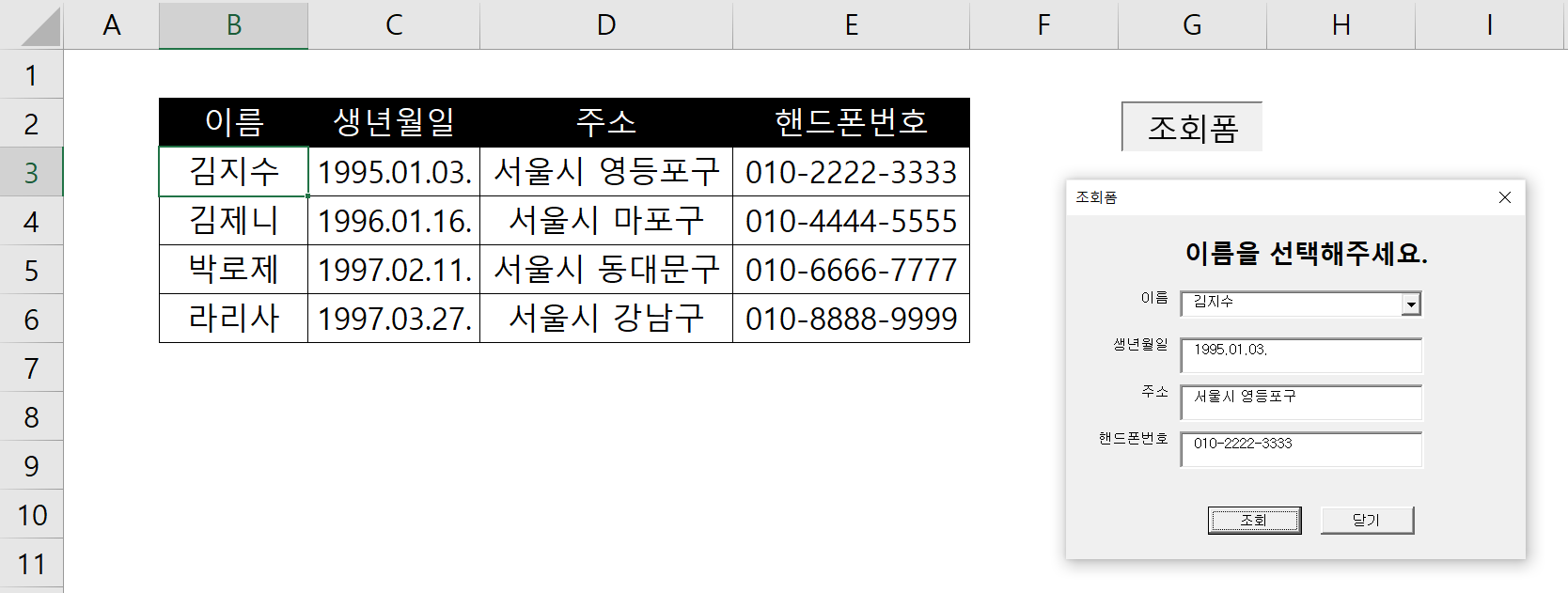 최종적으로 엑셀시트에서 "조회폼"을 클릭하면 사용자 정의 폼이 생기고 "이름" 콤보박스에서 원하는 이름을 선택한 뒤 "조회"버튼을 클릭하면 생년월일, 주소, 핸드폰번호의 정보가 자동으로 텍스트박스에서 보여지게 됩니다.