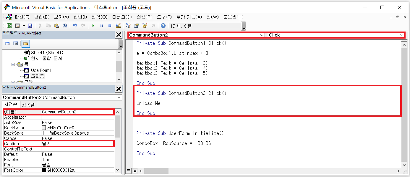 마지막으로 상단 메뉴에서 CommandButton2 - Click을 선택하면 CommandButton2_Click()이 자동으로 생성됩니다. CommandButton2는 바로 "닫기" 버튼인데요, "닫기" 버튼을 클릭했을 때 "조회폼"이 사라져야 하므로 이때는 Unload Me라고 적어주시면 된답니다. 이제 모든 프로세스가 완성되었습니다.