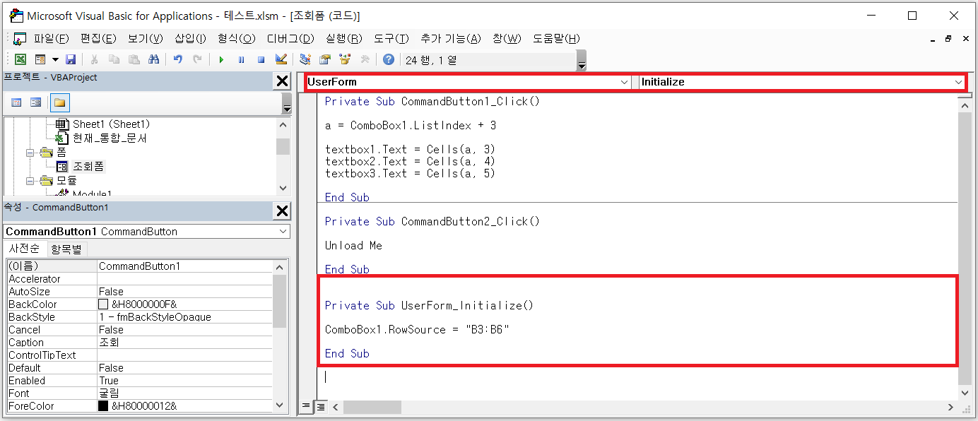 이제 단추를 클릭하면 조회폼이 실행되도록 만들었으니, 해당 조회폼 안에 있는 내용들에게 명령을 추가해보겠습니다. 먼저 조회폼이 처음 실행되었을 때 우리는 "이름" 중에 하나를 콤보박스에서 선택할 것이기 때문에 사용자 정의 폼(UserForm)이 처음 실행되었을 때(Initialize) 콤보박스 안에 "이름"들이 나타나도록 설정해주겠습니다.