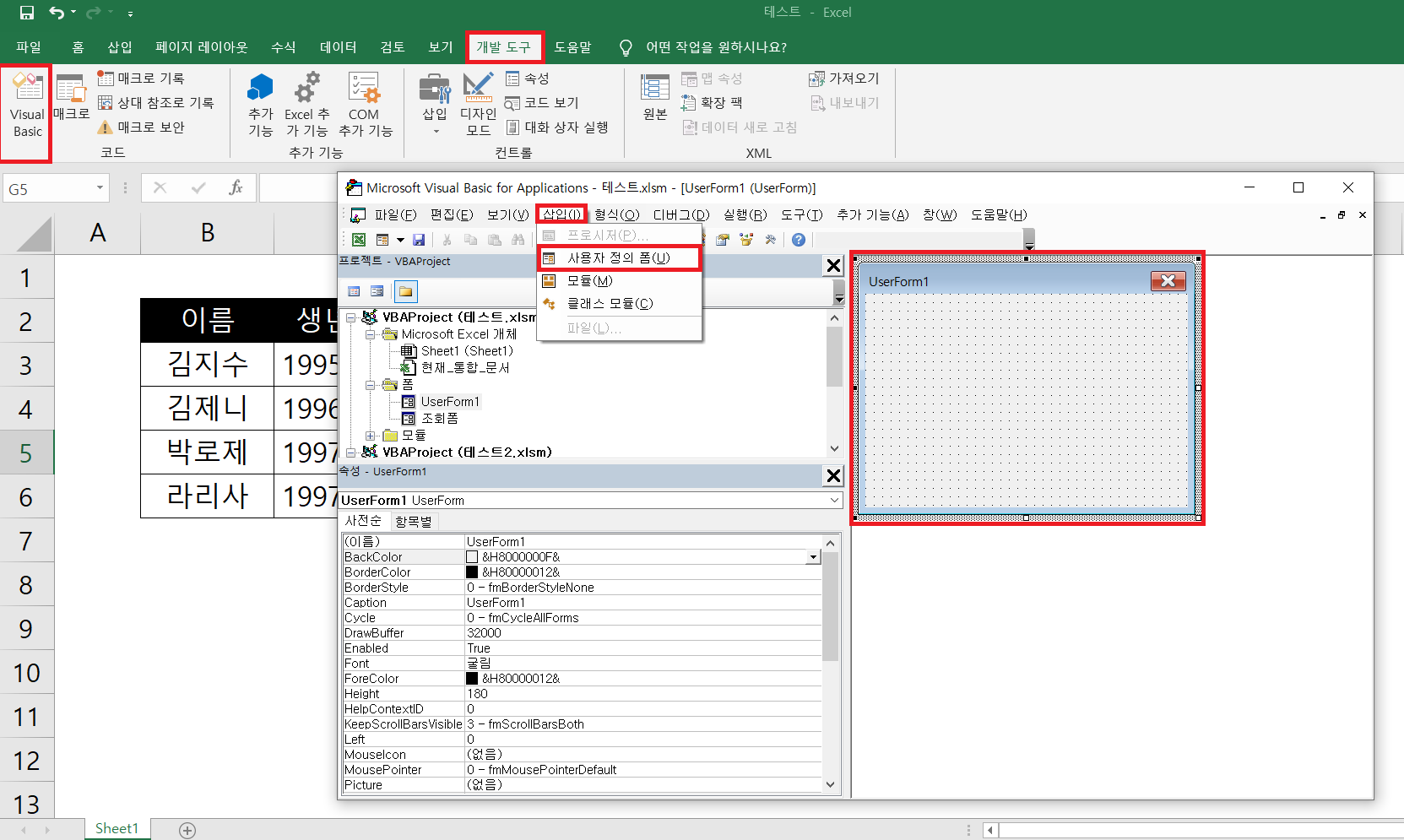 1) 엑셀 - 개발 도구 - Visual Basic - 삽입 - 사용자 정의 폼을 차례대로 클릭합니다.
