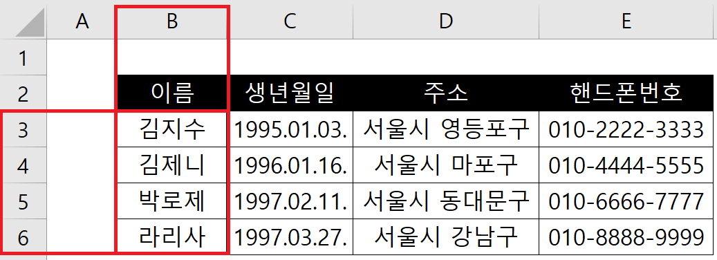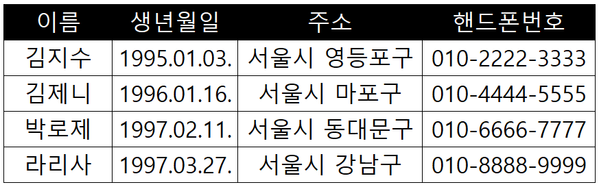 우선 간단한 표를 준비해봤습니다. 블랙핑크(BLACKPINK) 멤버들의 이름, 생년월일, 주소, 핸드폰번호를 임의로 넣어봤는데요, "사용자 정의 폼"을 사용해서 각 멤버들의 이름을 선택하면 생년월일, 주소, 핸드폰번호가 조회되는 프로세스입니다.