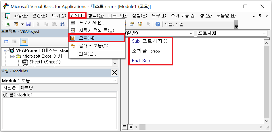 1) 모듈 창을 열고 Sub 프로시저를 열어줍니다.