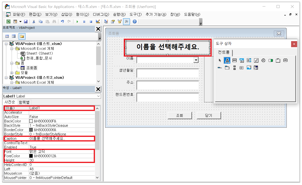 이제부터 본격적으로 사용자 정의 폼을 꾸며보겠습니다. 우리는 "이름"을 선택했을 때 생년월일, 주소, 핸드폰번호 등의 정보를 보여주는 사용자 정의 폼을 만들 예정이기 때문에, 사용자가 사용자 정의 폼의 기능을 쉽게 인지할 수 있도록, "이름을 선택해주세요."라는 텍스트를 적어봤습니다. 왼쪽 빨간칸의 속성 부분을 보시면 (이름)에 들어간 Label1은 이 텍스트 레이블 자체의 이름이고, 보여지는 내용은 Caption에 적혀있는 "이름을 선택해주세요."라는 텍스트라는 사실을 확인하실 수 있죠. 이 텍스트는 Font 부분을 더블클릭해서 글씨체, 글씨크기 등을 변경할 수 있고 ForeColor 부분을 클릭해서 글씨색상을 변경할 수도 있습니다.