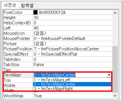 ※ TextAlign : 속성에서 TextAlign을 보시면 왼쪽 정렬(Left), 가운데 정렬(Center), 오른쪽 정렬(Right)도 선택할 수 있답니다 :)
