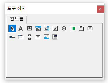 사용자 정의 폼은 해당 폼을 예쁘게 만들어 주기 위한 "도구 상자"를 가지고 있습니다. 사용자 정의 폼을 삽입하면 자동으로 생성되는데요, 왼쪽에서 → 오른쪽 순서대로 도구 상자 안에 있는 각 기능을 간단하게 살펴보겠습니다.