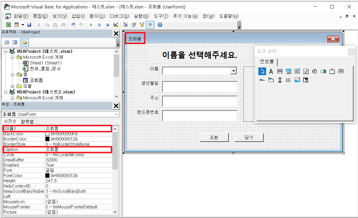 단, 이때 주의하실 점이 있는데 사용자 정의 폼의 실제 이름과 보여지는 이름이 다르다는 점인데요, 아래 화면 왼쪽 빨간칸처럼 (이름)에 들어가는 부분은 이 사용자 정의 폼 자체의 실제 이름이 되고 Caption에 들어가는 부분은 이 사용자 정의 폼에 보여지는 이름(제목)이 됩니다. 예를 들어, 만약 Caption에 "조회폼"이 아니라 "이름 조회하기"라고 적었다면 오른쪽 빨간칸의 사용자 정의 폼에 있는 제목은 "조회폼"이 아니라 "이름 조회하기"가 되었겠죠.