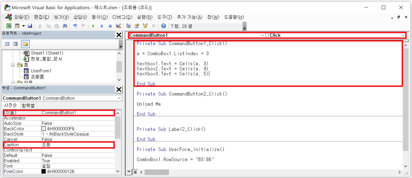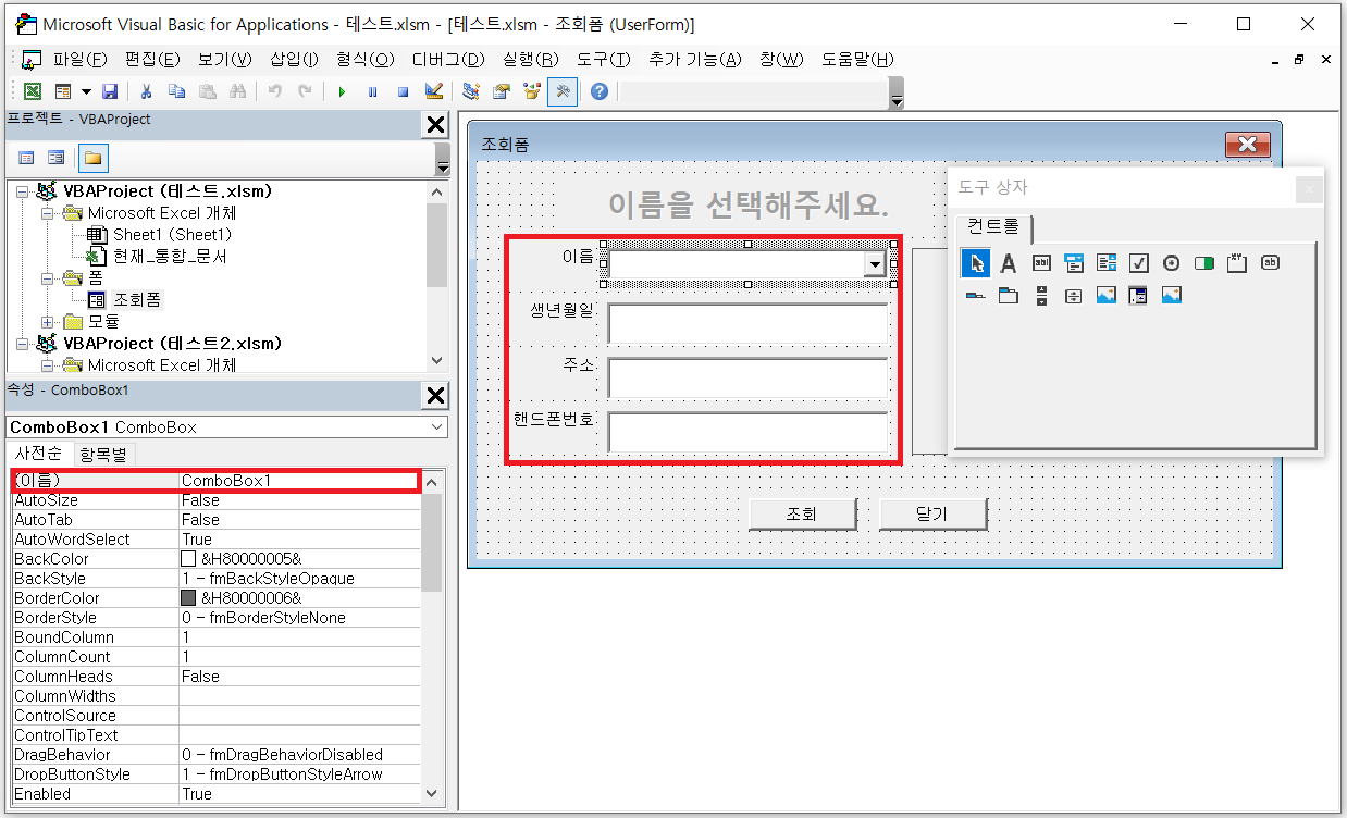 앞서 계속 사용자 정의 폼이나 콤보 박스, 명령 단추 등의 (이름)을 확인하고 있는데요, 앞으로 명령을 부여할 때 해당 (이름)이 필요하기 때문이랍니다. ComboBox1, CommandButton1 ... 의 이름이 혼동되신다면 UserForm1을 "조회폼"으로 변경했던 것처럼 기억하기 편한 이름으로 변경하셔도 됩니다 :)
