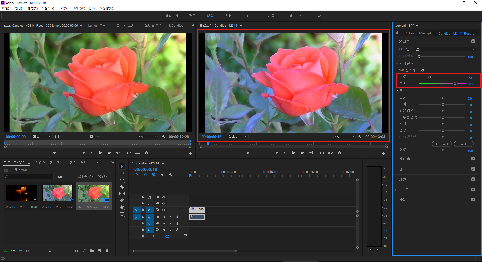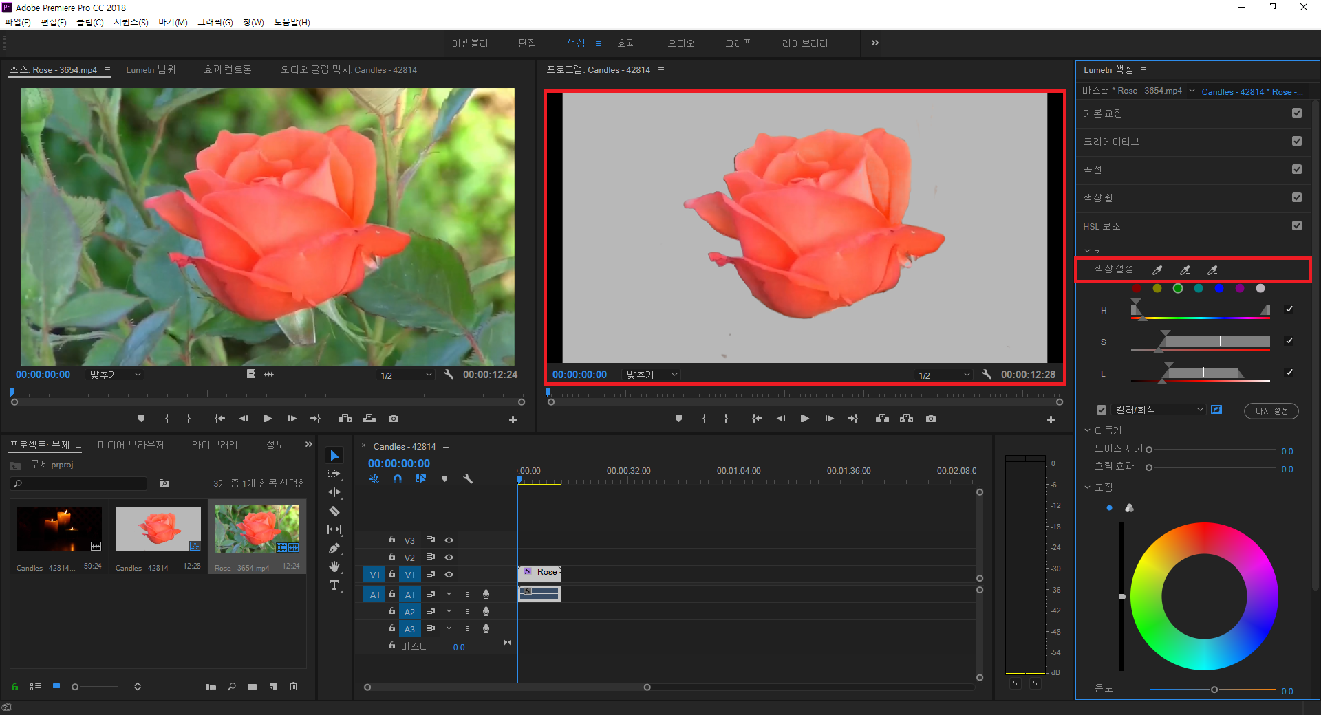다음은 색상 변경 (HSL Secondary) 입니다. 저는 장미 동영상을 선택했는데 동영상 안에 있는 이 장미의 색상을 빨간색에서 → 보라색 계열로 바꿔주는 작업을 해보겠습니다.
